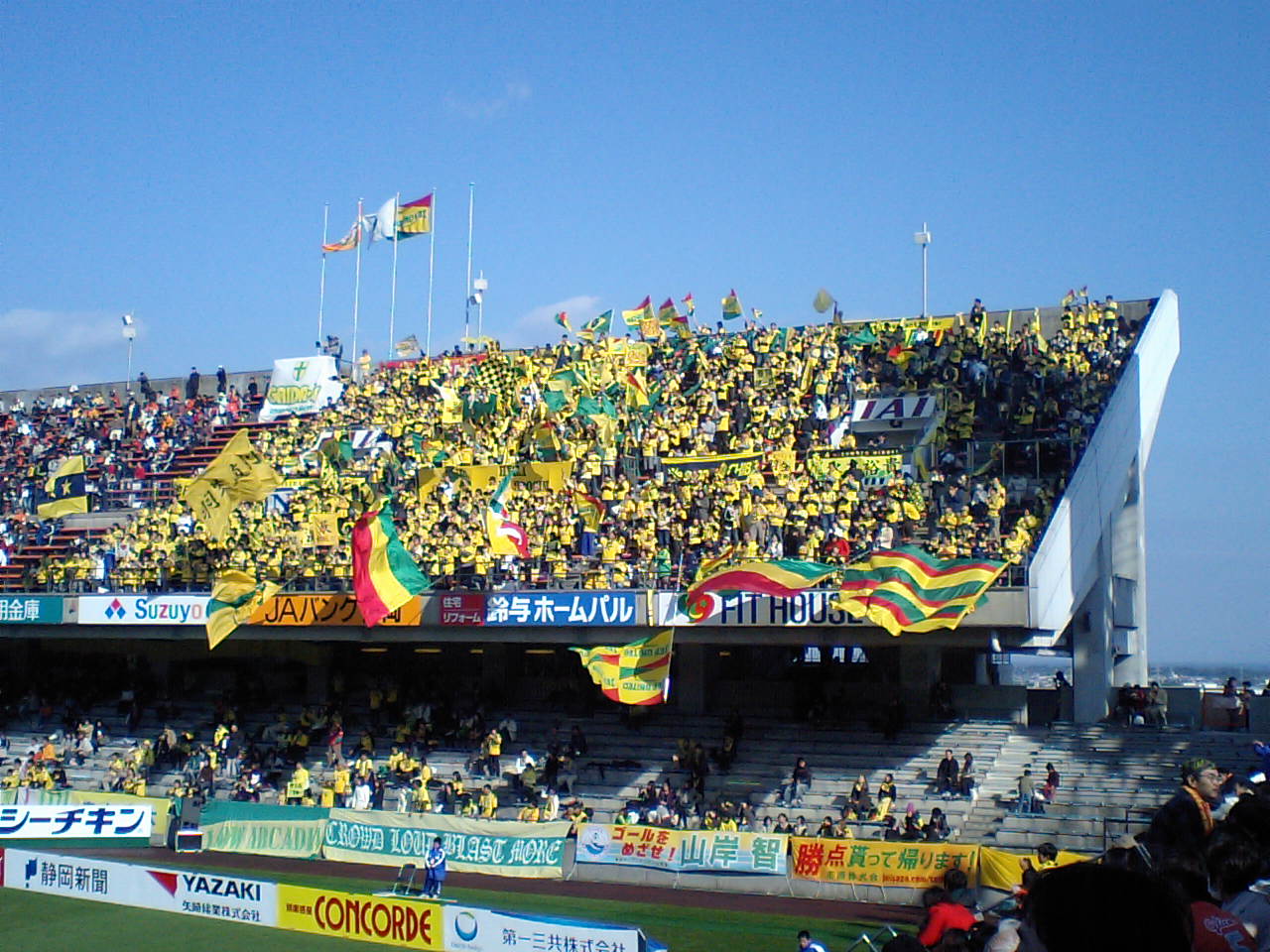 旅行といえばご当地の食。 次に立ち寄ったのは 「地酒」というのぼりが立つ コンビニ。 そこで見つけたのは 「登呂の里」 教科書でおなじみの登呂遺跡が、近くにあるそうで。 昨年も教科書でおなじみの岩宿遺跡行きましたし 遺跡づいてますね。 次は吉野ヶ里?三内丸山? そのコンビニではこれも売ってました。 「おでん缶」 「静岡("しぞーか"と読むらしい)おでん」と銘打たれたこのおでん缶は 黒いはんぺんと黒い汁が特徴だそうです。 先日食べたおでん缶の亜流 ラーメン缶はなかなかアレでしたが 本家おでん缶の味は。 「おでん缶」をつまみに「登呂の里」って 結構キテるね。 日本平スタジアムへの道中、 海岸沿いを車で走ってると 道端に「生しらす」の文字。 旅行といえばご当地の食。 もちろん買いました。 駿河湾の生しらす。 1パック500円。 スタジアムのスタンドで食べました。 何もつけずそのままで食べてもほんのり塩味。海の味。 頭の部分がしらすの味で、 身の部分は白身魚の味。 生しらす食べてたら白米食べたくなって スタジアムの売店行ったら いかにも生しらすに合いそうなもん売ってた。 「山かけ丼」 このやまいもが白米にかかったどんぶりの上に生しらすをぶっかけ さっきコンビニで買った醤油をちょろっとかける。 う、う、う、 うますぎー! まじ山かけ丼に生しらす合いすぎ。コラボしすぎ。 まじでこの山かけ丼、 生しらすのせるために存在してたんじゃないかってくらい合いすぎ。 しかも売店で売ってた山かけ丼、僕が買ったのが最後の1個だったんだよ? まじこれ僕が山かけ生しらす丼食えたの運命でしょ。 まじ超ディスティニー。 あと、醤油って調味料まじ最強だと思った。 まじ超ソイソース。 ジェフ千葉ファンの僕ですが 試合観戦のために遠征したのははじめて。 清水エスパルスのホーム日本平スタジアムは、 観客席とフィールドが近い。 千葉の清水の選手たちが 巻が水本が藤本が伊東テルが すぐ目の前にいる。 そしてこの日本平スタジアム、 なにが素晴らしいって、 試合前の 清水エスパルスマスコット「パルちゃん」の パフォーマンスが最高! スポンサー紹介などするのですが それが実にユーモアに溢れてて、 あの何とかブートキャンプやらあのなんとかかじり虫やらあのなんとかザイルのなんとかなんとかtrainやら、 流行を採り入れたパフォーマンスが工夫凝らされてて 試合を待ちきれない僕らを楽しませてくれた。 「おもしろいし、また見に来ようかな。」 って思わせてくれるこのパフォーマンス、 是非他のスタジアムでも。他のマスコットも。 試合の方はというと 試合開始早々ジェフに退場者が出て 防戦一方。 大敗もやむなし…な試合だったのですが、 巻のビューティフルボレー、 そして、 ジョルジェビッチの 70m超ロングシュート。 70mのゴールはJ1史上最長距離ゴール。 目の当たりにした僕は、度肝抜いた。 入った瞬間 「えっ、ぁ、ぁぁあぉぉぉぉぉおおおおおーーー!!」 っつって。思わず立ち上がった。 いいもん見れた。 結果は2-2。 劣勢からの引き分けは上々。 これで、僕が観戦した試合のジェフ不敗神話継続中。 (3戦3分けだけどね…) calendar